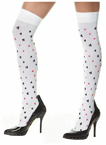 Thigh-High Card Print StockingsComplete your Queen of Hearts or other Alice in Wonderland sexy costume with these 100% white nylon stockings with black and red card symbols. An elastic band at the top holds the stockings in place for all night wear. On size fit most adults (90-160 lbs). Play your hand perfectly with these unique stockings!
