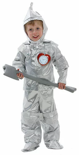 Silver ShirtMatching PantsSilver Headpiece w/Fabric FunnelSilver Shoe CoversEnjoy being part of the L. Frank Baum’s children’s tale in this child Tin Man costume. The entire ensemble has a silver metallic coating. The shirt snaps up the front for closure and has a detachable bow. The matching pants have an elastic waistband for a comfortable and secure fit. Elastic also secures the included shoe covers around the ankle and to the shoe. Top this costume with the hood which features an attached funnel. This Tin Man costume certainly has plenty of heart. Share what makes the silver Woodsman tick in this Wizard of Oz costume.