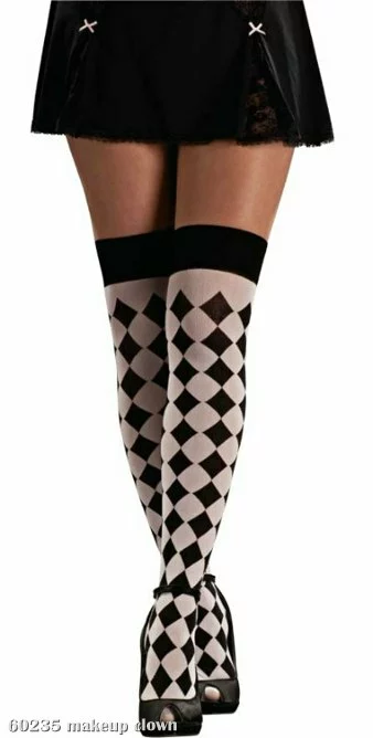 Whether you’re looking to finish off your Fat Tuesday look or want to accessorize your Queen of Hearts costume, these thigh highs are the perfect choice! These tights are black and white harlequin print with a black band at the top.