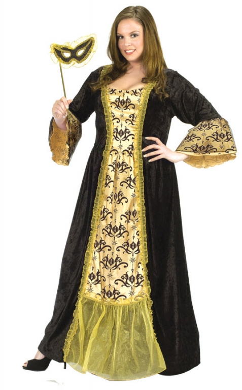Costume Includes: Crushed black velvet dress with shimmering gold inset, ruffle sleeves, and handheld eye mask.