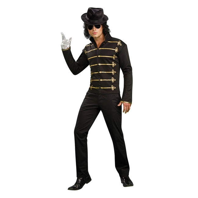 You can pay tribute to the true King of Pop legend in our iconic Michael Jackson Black Military Jacket. He was a fashion icon with complicated, smooth dance moves that awed audiences. Our black military jacket features gold lamé piping and printed gold detailing that is sure to complete any Michael Jackson costume. Follow the road to stardom with this famous black military style jacket with gold striped embellishments fit for a celebrity. This 80’s Michael Jackson Adult Jacket is designed after the HIStory Michael Jackson tour where he dressed in a military style outfit.