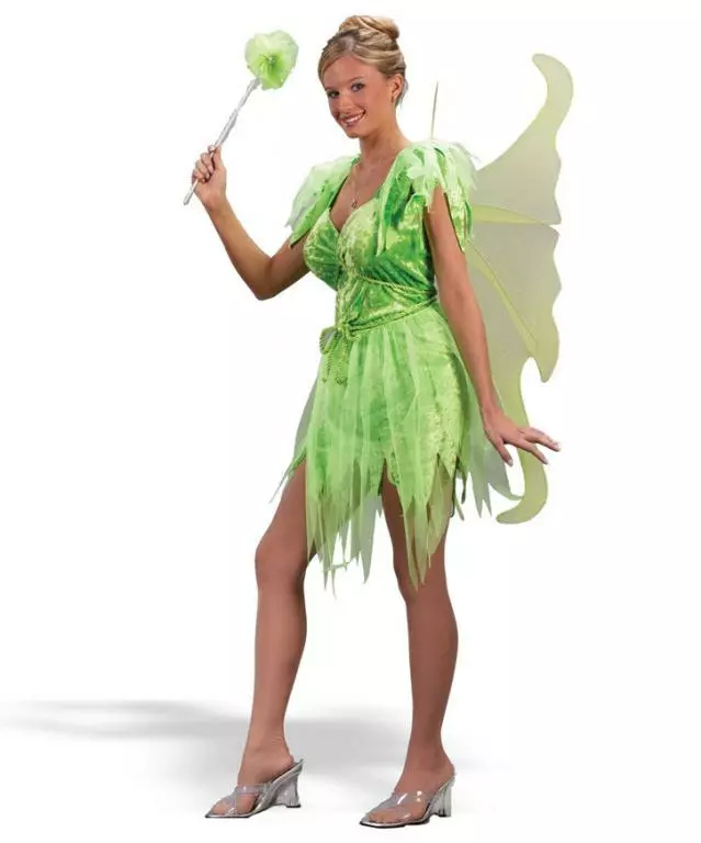 Tinker Bell All Grown Up.To becomethe neverland fairy, youwill need thisgreen plush polyester dress with rope belt, sheer apron, tatters, wings and wand.Available sizes: