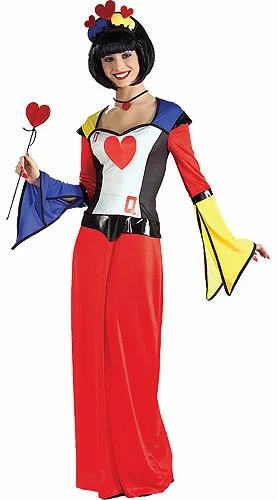Floor-Length DressCrown HeadpieceMatching Heart-Shaped WandMatching ChokerStop the show in this brilliant and bold Queen of Hearts dress! This bright-colored gown is made of polyester and has a style that accentuates your body in all the right places and adds a touch of flair. The red, yellow, and blue sleeves add a unique style. Vinyl black trim is attached at the elbows, shoulders, and waist for added detail. A Queen of Hearts card pattern is printed on the mid section. The choker ties at back of neck and the headpiece made of foam has three attached hearts and ties around back of head with string. Get this Queen of Hearts dress for a different look this Halloween.