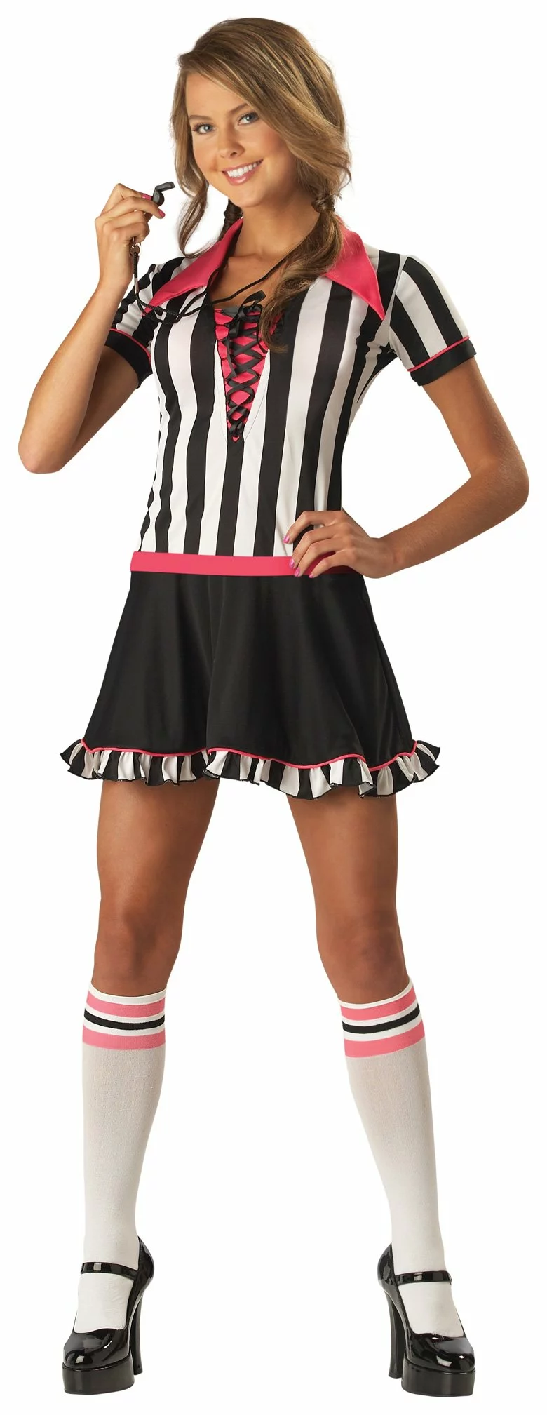 Make your own rules in the Rebellious Referee costume which includes: A bold and bringht black and white striped referee dress with pink underlay featuring a lace up ribbon embellishment, pink collar and fun mini-ruffles along the hem. Athletic striped knee-high stockings top off this sassy sporty ensemble.